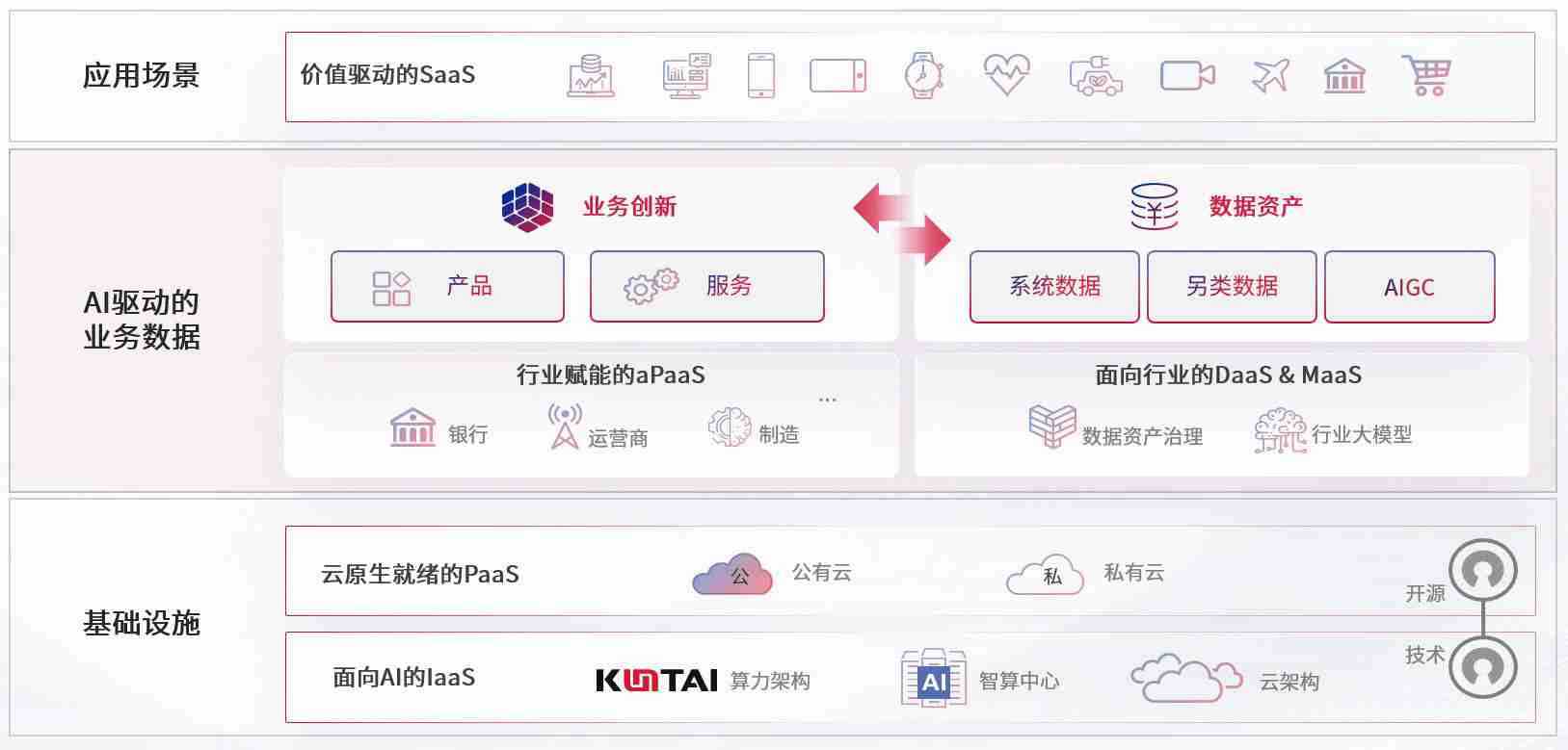数字时代,,围绕企业数字化转型的关键要素,,,,bob波币钱包数码开创性的提出数云融合战略和技术体系框架,,,,着力在云原生、、数字原生、、AI原生和信创产业上架构产品和服务能力,,,,为处在不同数字化转型阶段的快消零售、、、汽车、、、、金融、、医疗、、、、政企、、、教育、、运营商等行业客户提供泛在的敏捷IT能力和融合的数据驱动能力,,,构建跨界融合创新的数字业务场景和新业务模式,,,助力企业级客户建立面向未来的核心能力和竞争优势,,,全面推动社会的数字化、、、、智能化转型升级。。