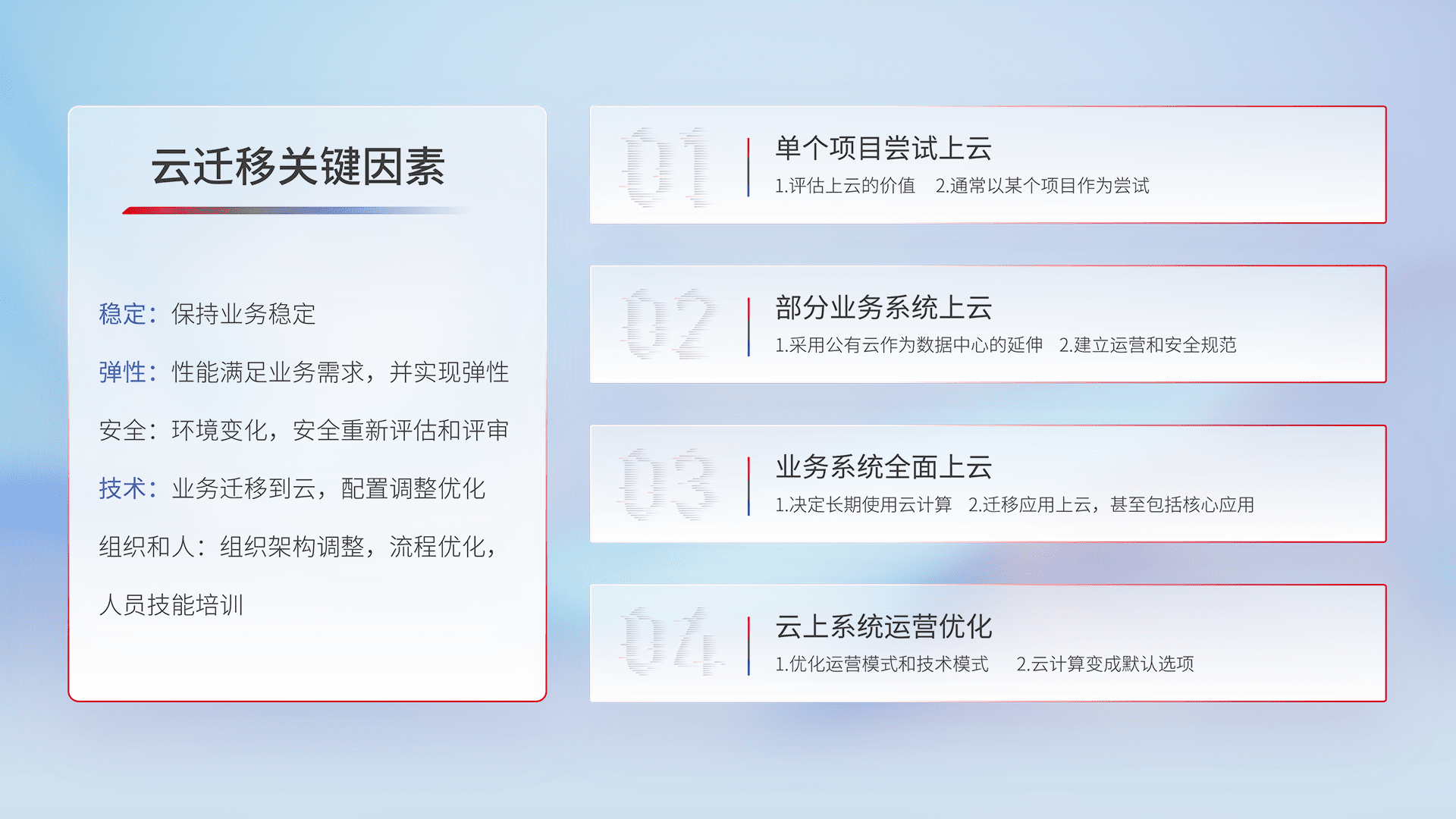 结合实际业务,,从规划设计、、、、云平台选型、、、、云原生改造、、数据迁移、、集成交付,,,迁移全过程为客户识别最佳上云路径,,,做好风险识别管理,,,,设计网络架构、、、、身份权限、、安全审计合规、、、、操作审计、、、日志审计、、监控告警策略、、多站点容灾设计等,,对云上基础设施进行整体规划,,,,提升IT治理水平,,,,以满足弹性、、高可用、、、高性能的需求。。。。