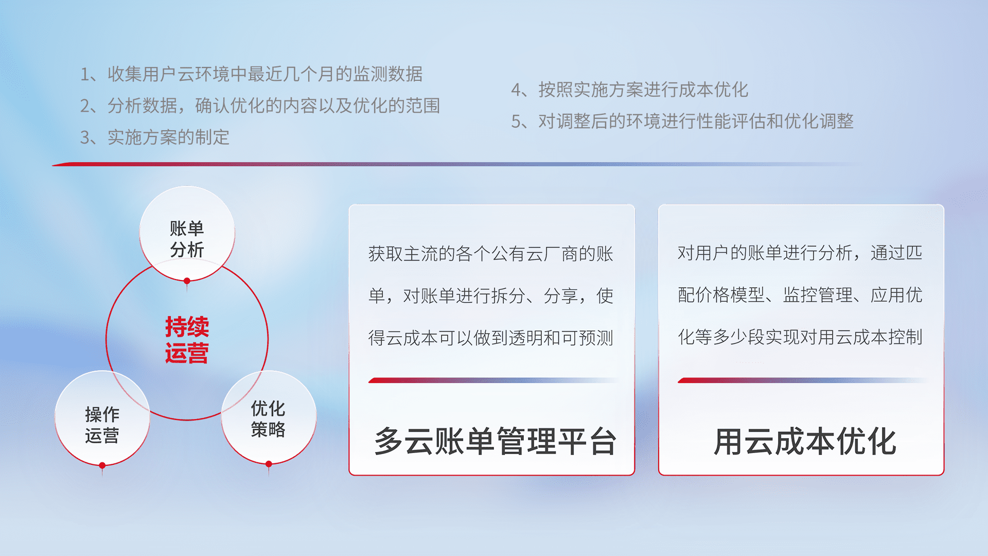 通过多云纳管,,,以统一的资源数据模型把客户的云资源进行抽象和封装,,进而实现对多云资源的统一操作,,,,保障云资源管理的可靠性、、稳定性与可用性。。。。量身定制化运维内容,,配置、、开发运维、、补丁管理、、备份、、、监控、、认证和访问管理、、、、审计和日常巡检等,,,,保障在用云过程中的可靠度,,,稳定度以及高可用率。。。。
